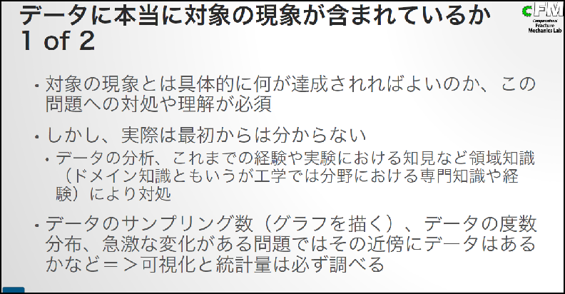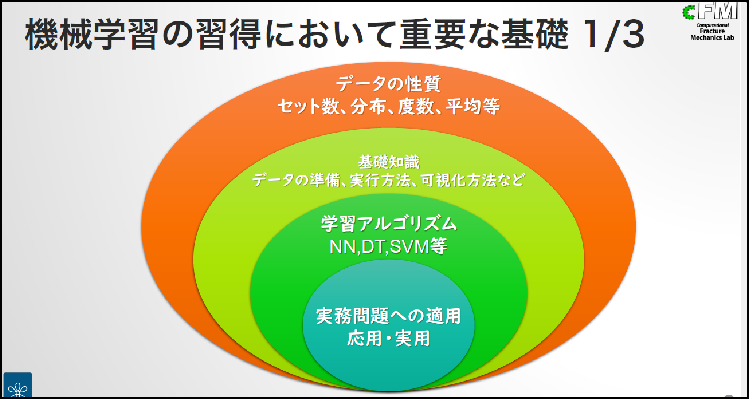 | 対象者 | ・機械学習に興味がある、やってみたい、やってみたけどよくわからないという設計者、実験担当者、CAE専任者など ・統計と重回帰の基礎知識(ガウス分布、平均、分散、決定係数などの基本事項)を有している方 ・統計学編の要件である数学の基礎知識がある方 |